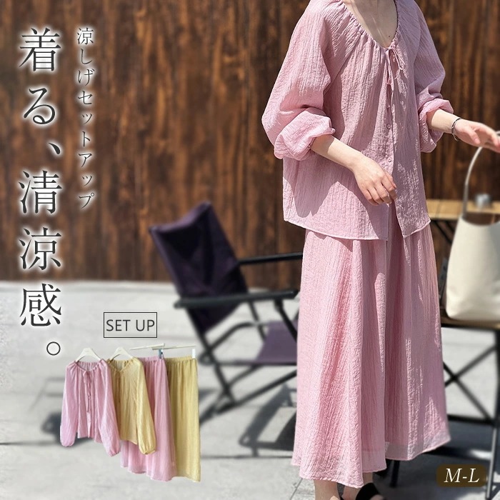 セットアップ 上下セット レディース 春 夏 秋2点セット トップス スカート シャツ ブラウス 無地 長袖 スカートスーツ ロングスカート ウエストゴム リボン付き シワ加工 体型カバー 着回し